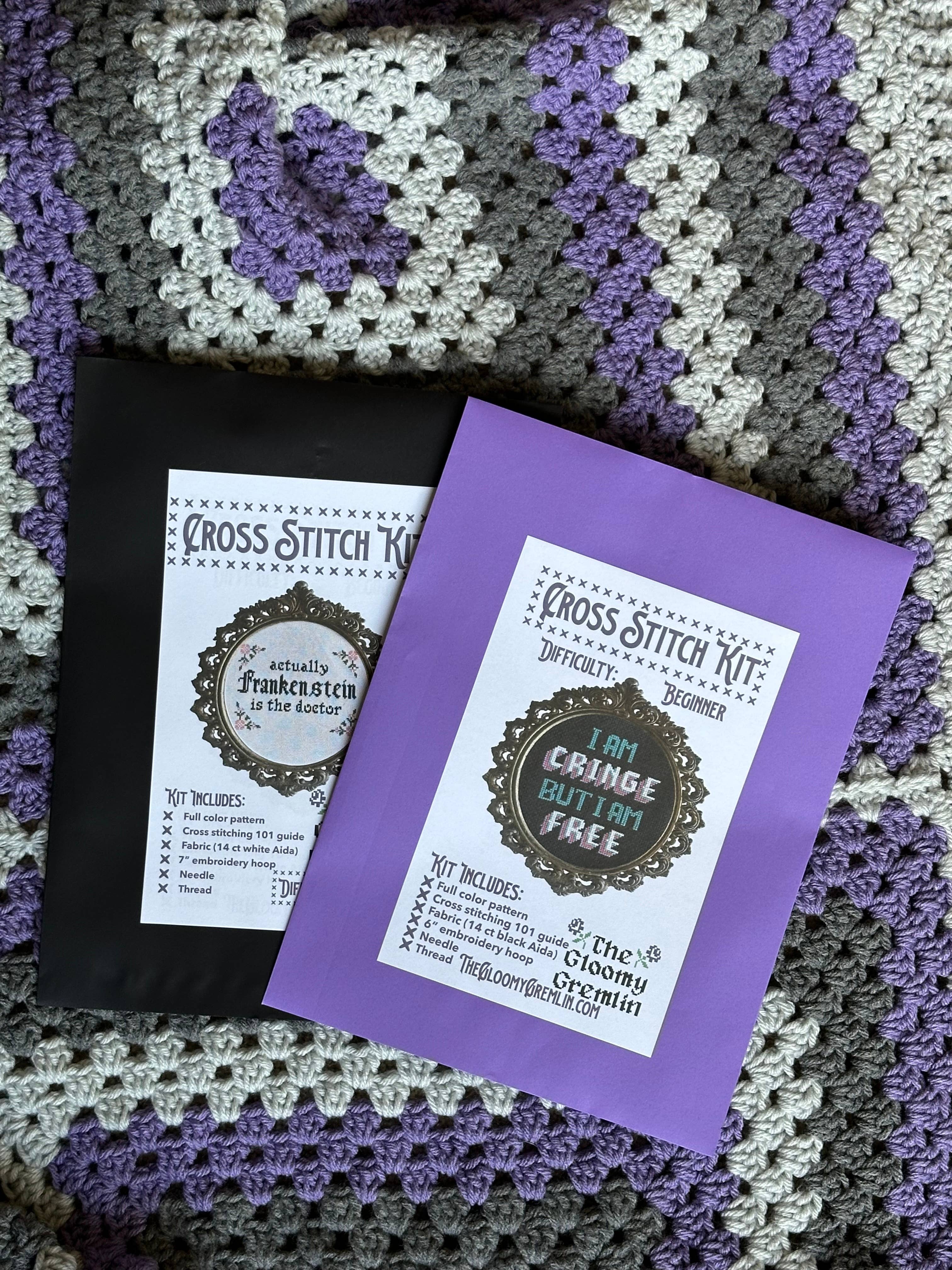I hand draw all The Gloomy Gremlin cross stitch patterns, and personally test stitch every one - absolutely no AI used. Celebrate Halloween year-round, or embrace your inner gothic horror nerd. Each kit comes packaged in a black or purple 9 x 12 clasp envelope, and includes the full color cross stitch pattern, a beginner cross stitching guide, 18 count white Charles Craft Aida fabric, DMC embroidery thread, an embroidery needle, and a 7" embroidery hoop.