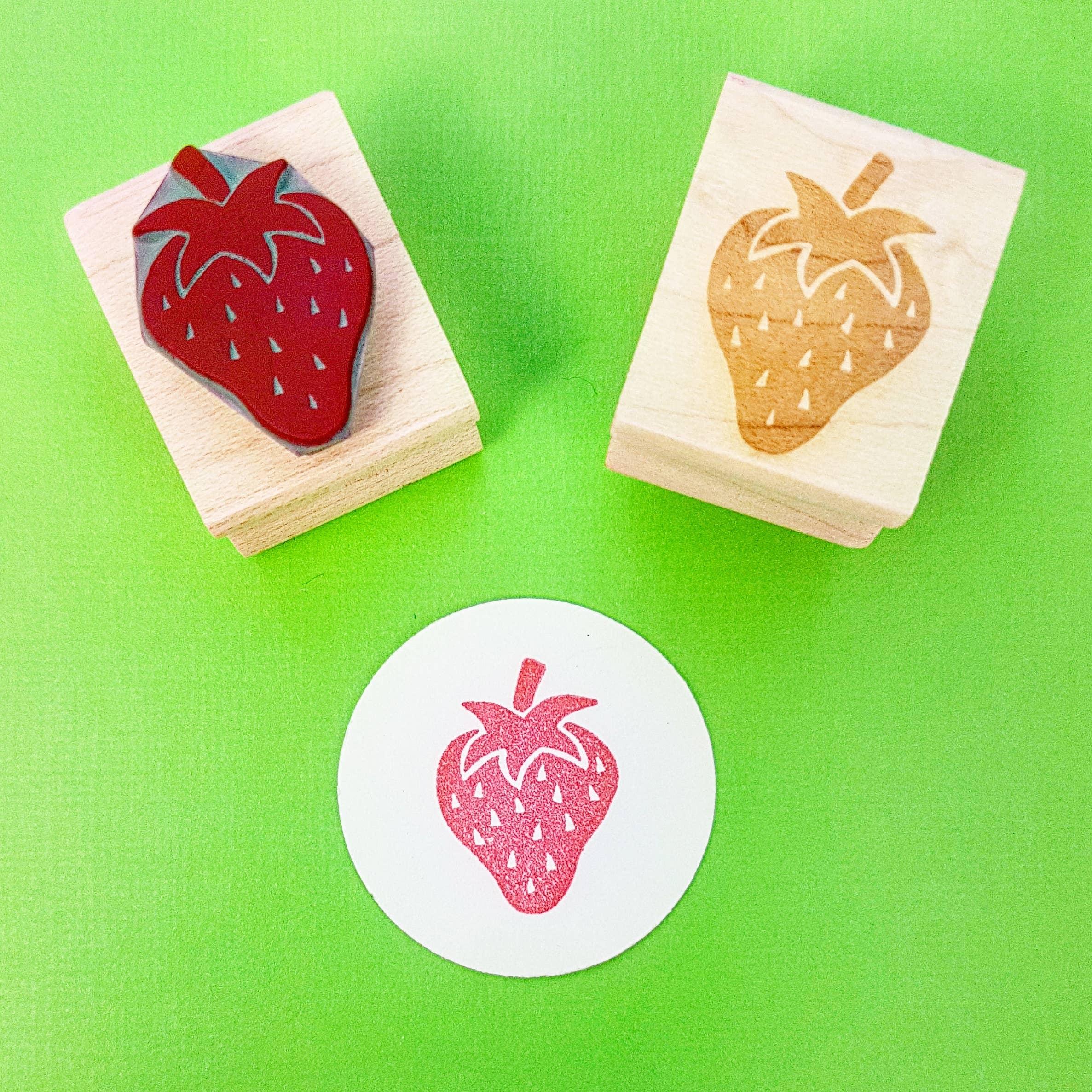 Little strawberry rubber stamp, great stamped on labels and tags for jam or any summery stamping projects! Complete with pips and leaf detail.