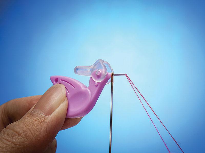 This type of needle threader is my favorite. It's stronger and more durable than the wire type and easier to get in the eye of the needle. The thread guide is a flat metal piece with a tiny hook on the end that easily grabs and holds the thread.