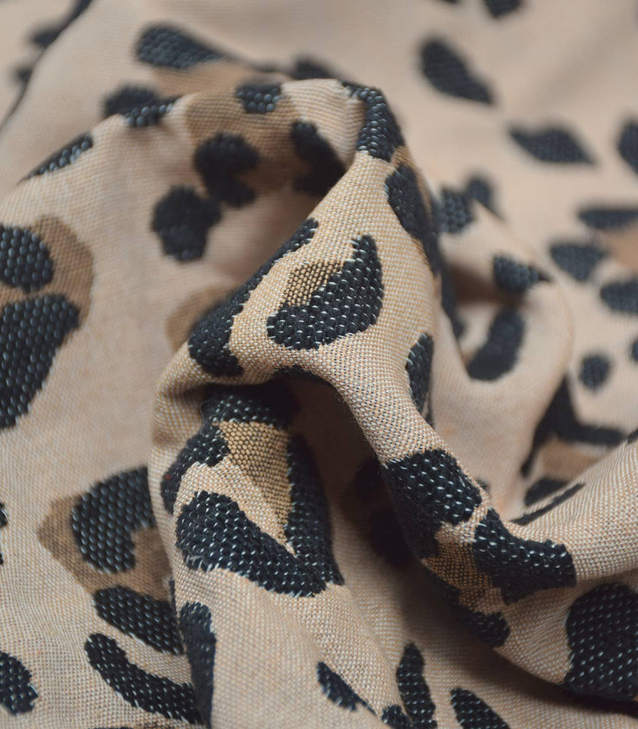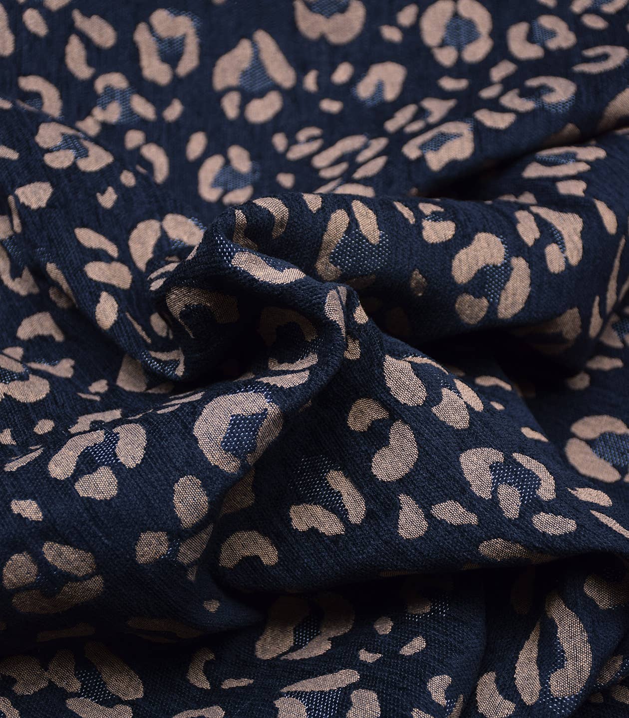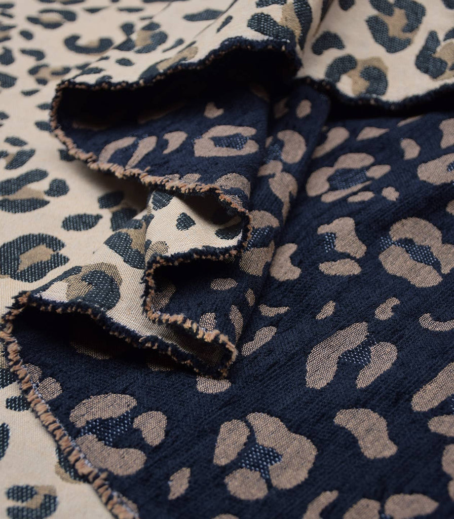 Jacquard with a velvet-like appearance on one side. Its deep black background highlights a tawny pattern in bright camel tones, for a rich and elegant contrast. Composition: 83% cotton 16% polyester 1% AF Width 160cm - 340g/m² - delicate wash 30°- Oeko-tex certified Made in Europe