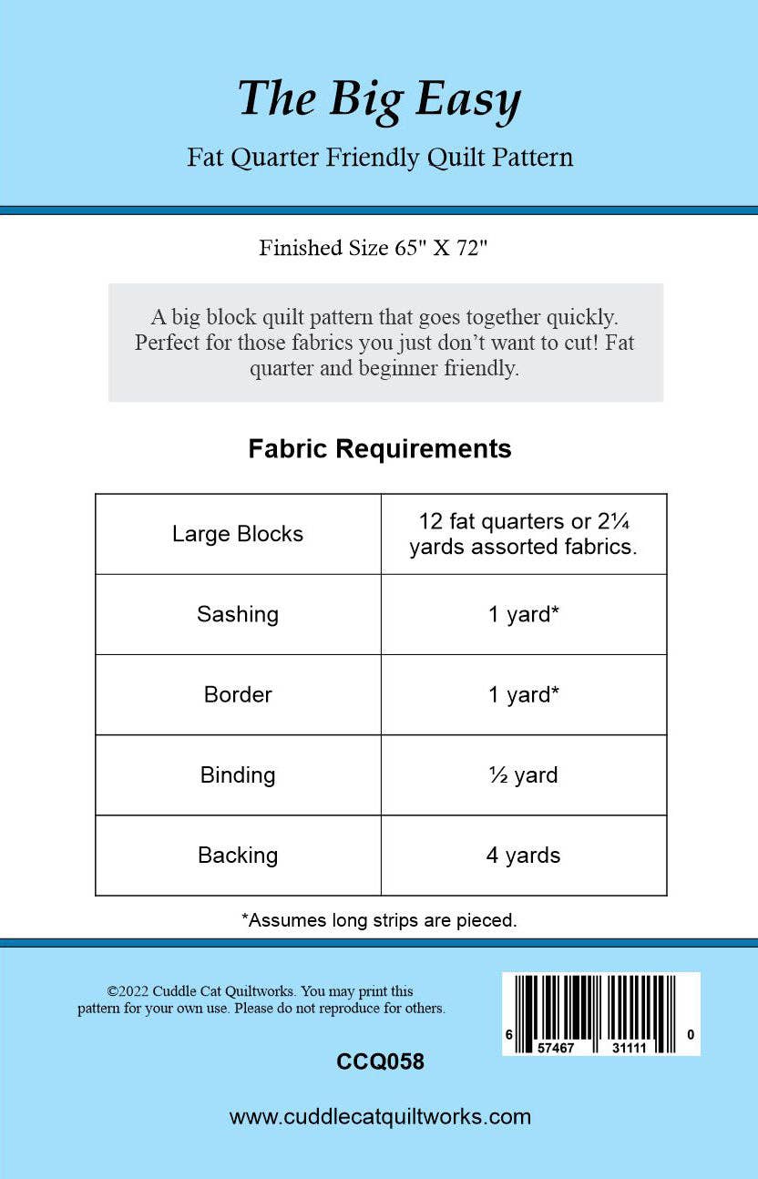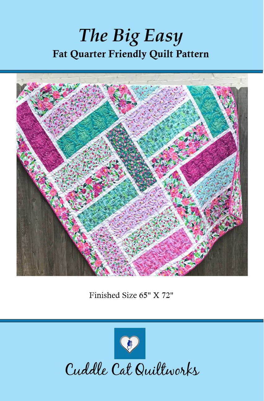 The Big Easy is a big block modern quilt pattern that goes together quickly, perfect for those fabrics you just don't want to cut! Fat quarter and beginner friendly. Pattern includes fully illustrated diagrams with easy to follow instructions. Finished size is 65" X 72" The Big Easy Pattern has been featured by Quilter's Digest.